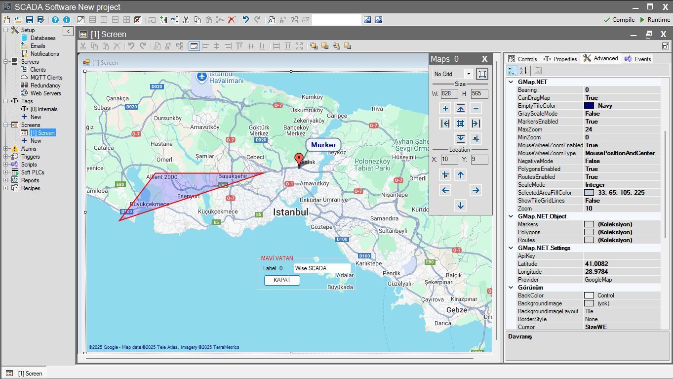 • Tag Güdümlü Navigasyon: Enlem, Boylam ve Zoom değerleri için tag tanımlayabilirsiniz. Scriptler veya tetikleyiciler aracılığıyla bu değerleri değiştirerek, SCADA sisteminin bir alarm durumunda otomatik olarak o bölgeye “uçmasını” sağlayabilirsiniz.