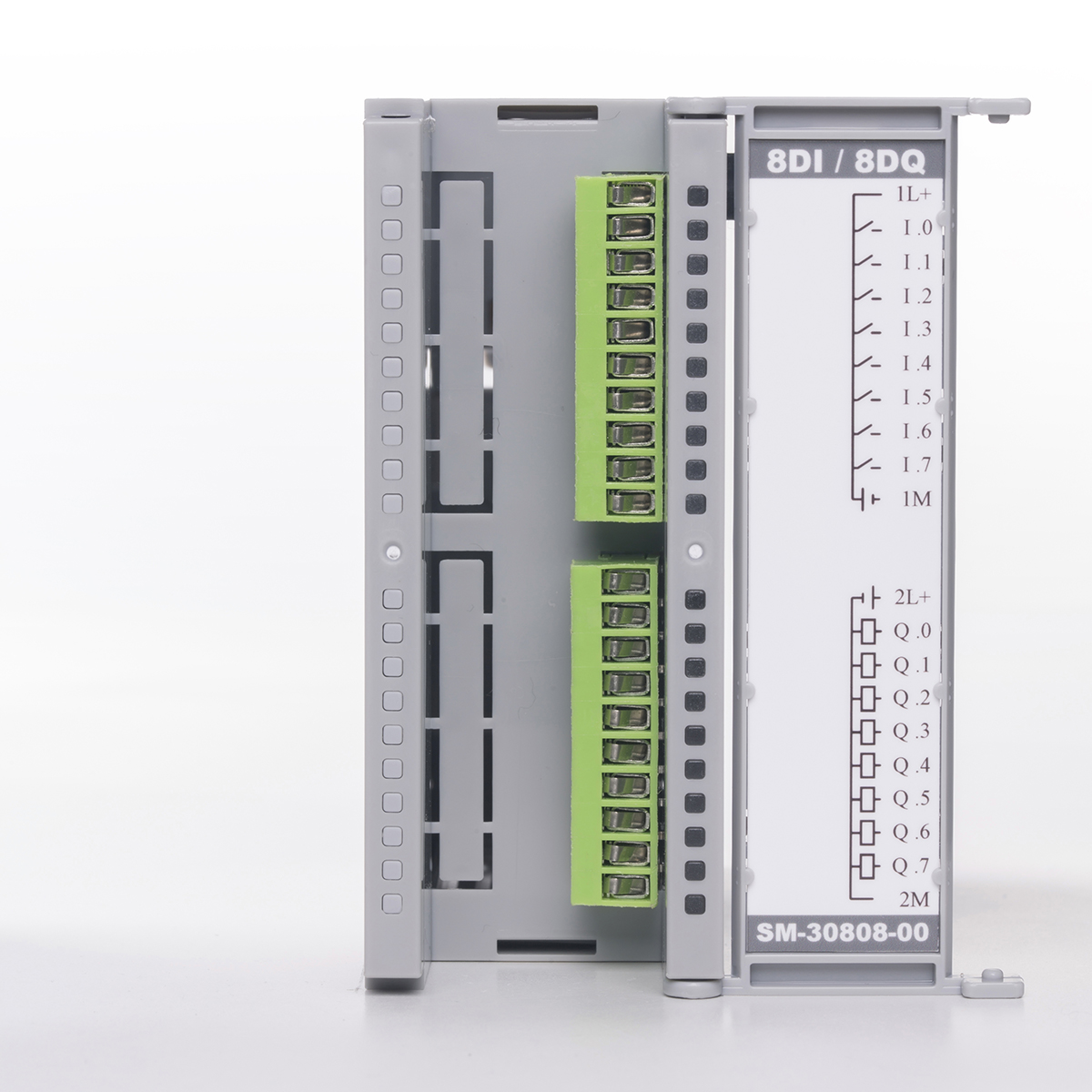 8 Kanal optik izoleli dijital giriş ve 8 kanal optik izoleli dijital çıkış modülü. Besleme gerilimi 20-28 V. DC. Dijital çıkış akımı 0.5 Amp. Maksimum giriş frekansı 50 Khz, çıkış frekansı 40 Khz.