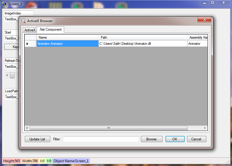 Açılan bu bu sayfada iki sekme vardır. Soldaki sekme bilgisayırınızda yüklü olan activex’ler sağdaki sekmede ise projede kullanılan .Net componentler bulunur. Her iki sekmede’de browse butonuna tıklayarak dosyayı seçebiliriz. Bu aşamada ücretsiz dağıttığımız Animator.dll kütüphanesini browse butonu ile bulup projemize entegre ediyoruz.