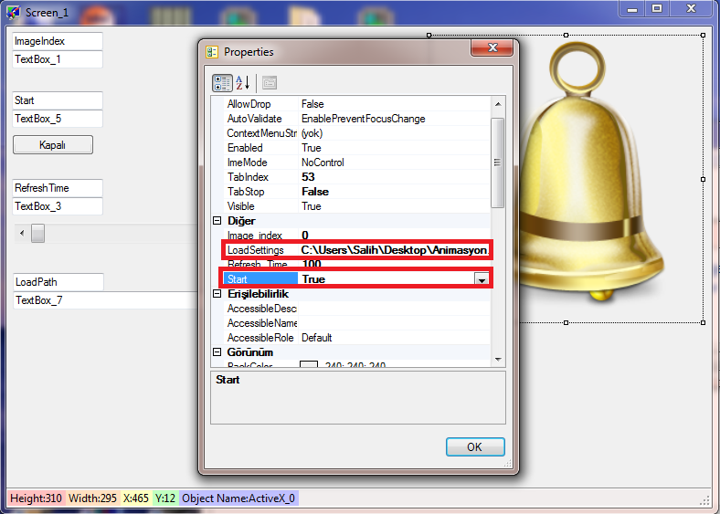 Bu activex için en önemli parametreler kırmızı ile işaretlenmiştir. Bu özellikleri Runtime’da değiştirmemiz mümkündür. Sonraki adımda anlatılacaktır.