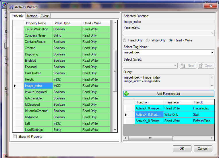Bu pencerede Property, Method ve Event olmak üzere üç sekme mevcuttur. Kulandığımız Animator.dll’sinin ihtiyacımız olan üç özelliği’de Property sekmesindedir. Sol’da bulunan değişkeni seçip Select Tag Name kısmından uygun sayı tipin’deki scada değişkenini seçip Add Function List butonuna tıklayarak Scada değişkeni ile senkron ediyoruz. Üç farklı metod ile senkron yapılabilir.