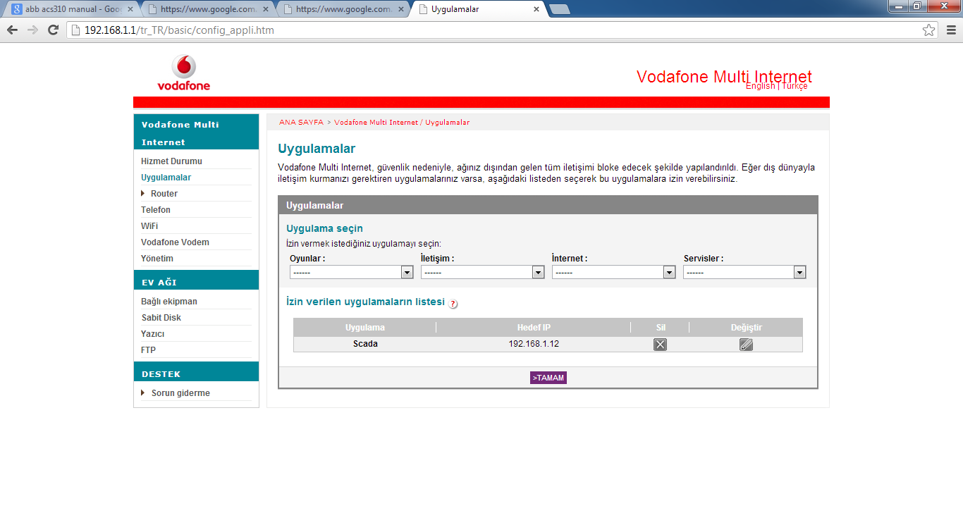UYGULAMALAR Kısmında (Modem ara yüzündeki açıklamayı okursanız, Standart kullanılan protokoller haricindekiler bloke edilmiş, özel kullanacağınız IP varsa buraya ekleyin tarzında açıklama mevcut)