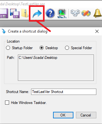 Yukarıda ki resimde gördüğünüz gibi Shortcut butonu ile açılan pencerede projeniz için kısa yol oluşturabilirsiniz. Bu şekilde oluşturulan kısa yol ile projeniz bekleme olmaksızın açılıp runtime çalışmaya başlayacaktır. Runtime kapatıldığında ise development açılmadan direkt olarak kapatılacak. Ayrıca “Hide Windows Taskbar” seçeneği ile ekranın alt bölümünde bulunan Windows butonları kapatılabilir. Ctrl + Esc ile bu butonlar tekrar açılabilir. Veya scada kapatıldığında otomatik olarak açılacaktır.