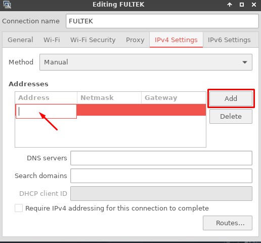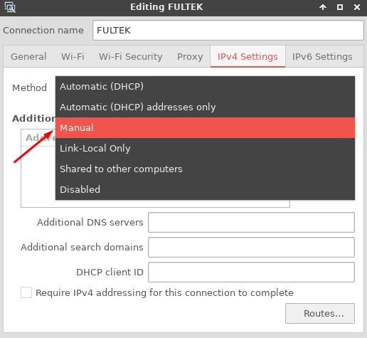 Bu kısımda “IPv4 Settings” sekmesinde “Method” kısmını “Manual” olarak değiştiriyoruz.